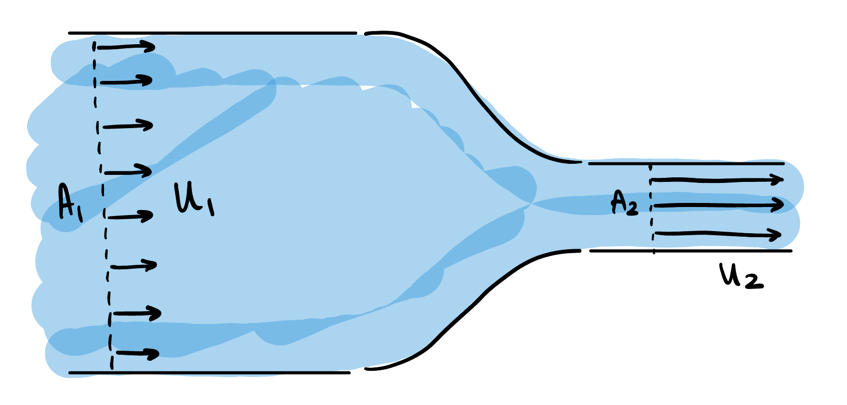 However, since mass must be conserved, that fact that there is a smaller cross-sectional area downstream must mean that the velocity is higher downstream. Therefore, \(U_2 > U_1\text{,}\) and to achieve this, the fluid must therefore have been accelerated somewhere within the channel.