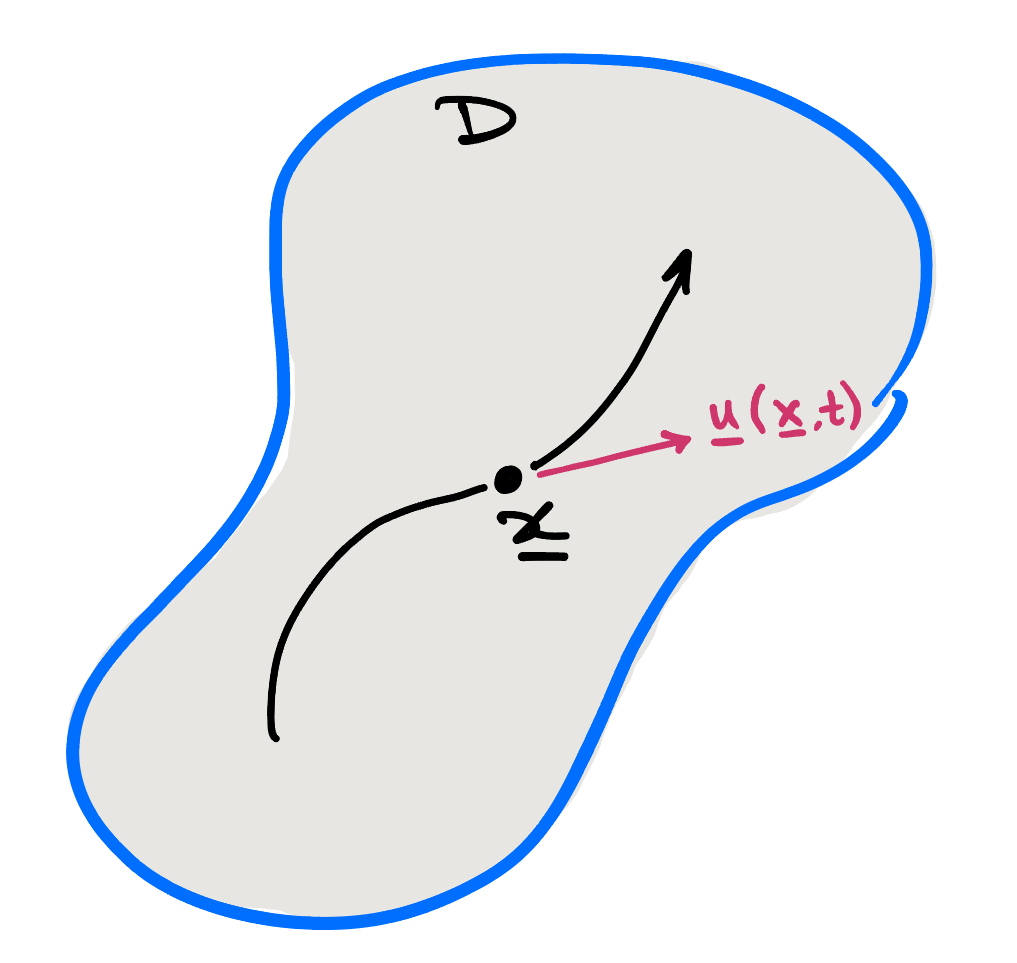 Let \(\bx\in D\) be a point in \(D\) and consider the particle of fluid that moves through the point \(\bx\) at time \(t\text{.}\) In the figure below, we sketch the trajectory that this particle might take within the fluid. Also at the point \(\bx\) at time \(t\text{,}\) we let \(\bu(\bx, t)\) be the velocity of the particle. At each fixed time, we can imagine the velocity vectors drawn at each point in the fluid; thus we call \(\bu\) the velocity field of the fluid.