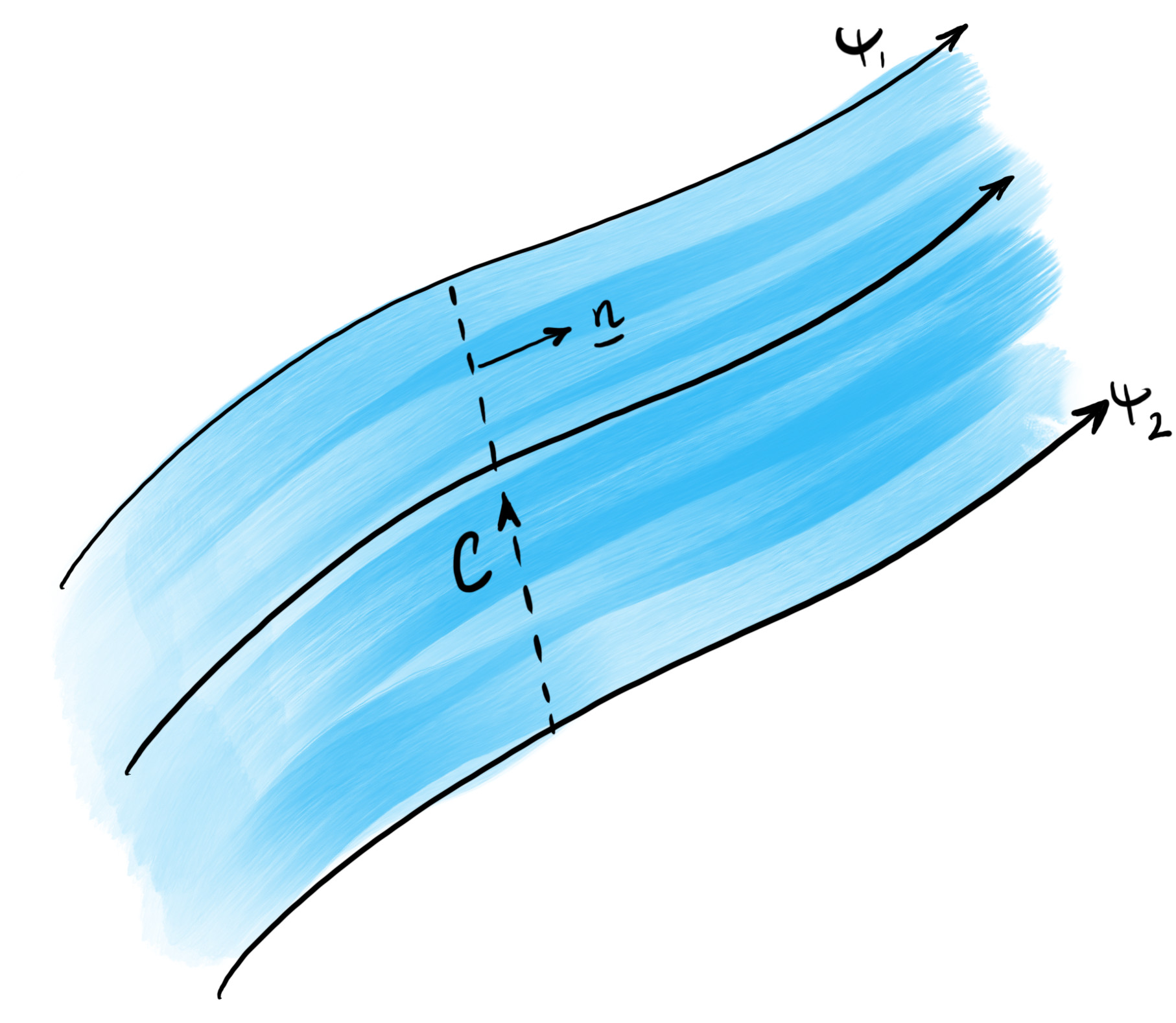 Figure4.2.2.Flow between two streamlines, where the streamlines \(\psi_1\) and \(\psi_2\) are constant. Later, we will consider the flux through the contour \(C\) illustrated in the figure along with its unit normal \(\bn\text{.}\)